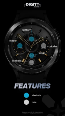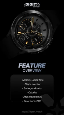 - Watch face displays: time (digital + analog), am/pm, steps, approximate burned calories, battery level