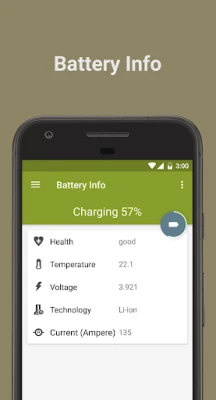 "Battery Info" shows the battery charging/discharging current and also gives information about battery health, voltage and temperature.